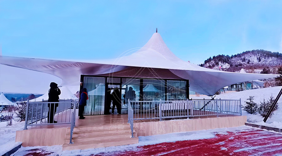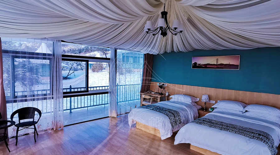 在延伸消费场景、提升客单价方面,酒店帐篷更是滑雪场的 “盈利加速器”。如今的冰雪游客不再满足于单纯的滑雪体验,更追求 “沉浸式冰雪度假”,而我们的酒店帐篷能打造独特的冰雪住宿场景。例如,针对滑雪场推出的 “雪地星空帐篷”,采用透光性强的 PVC 篷布,夜晚可躺在床上仰望雪地星空,帐篷内部配备地暖、独立卫浴、舒适床品等设施,即使在 - 20℃的低温环境下,室内温度仍能保持在 20℃以上,既保留了与自然亲密接触的野趣,又兼顾了住宿的舒适度。这种差异化的住宿体验,能帮助滑雪场吸引更多高端客群,将客单价从单纯的滑雪门票 + 基础住宿,提升至 “滑雪 + 特色住宿 + 雪地下午茶 + 夜间观星” 的高附加值套餐,据合作滑雪场数据显示,引入酒店帐篷后,客单价平均提升 30% 以上。