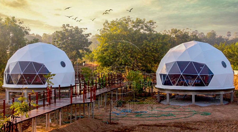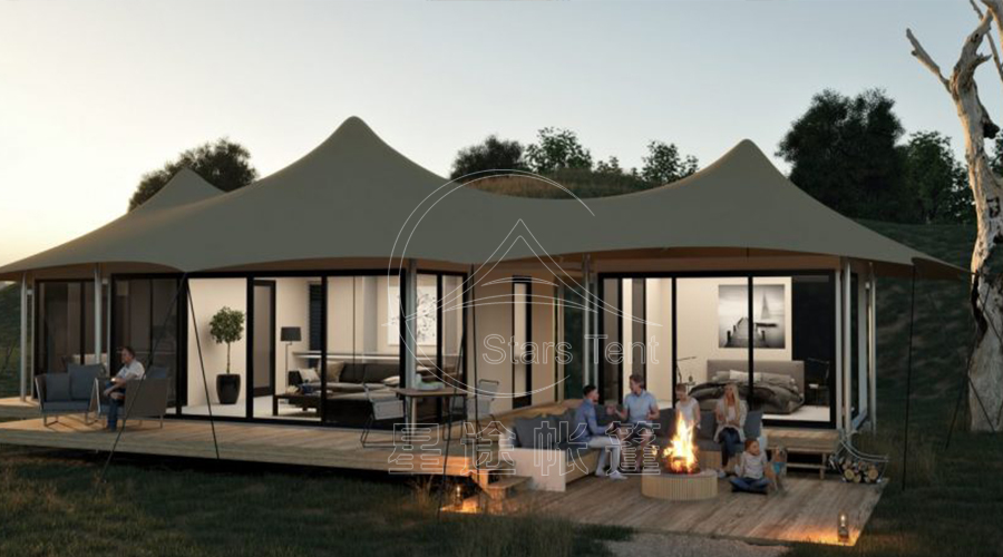 从核心住宿功能来看,我们的装配式酒店帐篷彻底解决了滑雪场住宿难题。不同于传统酒店动辄半年的建设周期,我们的帐篷采用模块化设计,所有组件在工厂预制生产,运至滑雪场现场后仅需 15 天即可完成批量搭建,大幅缩短滑雪场住宿配套落地时间。针对 - 30℃的极端风雪天气,帐篷从面料到结构进行了全方位抗寒升级:外层采用高密度抗撕裂牛津布,搭配加厚 PVC 涂层,抗风等级达 10 级,可抵御暴雪积压;内层加装 5cm 厚高密度保温棉,配合独立地暖系统与智能控温装置,即使室外温度低至 - 30℃,室内仍能稳定保持 22-25℃的舒适温度,让游客在冰雪环境中也能享受温暖住宿体验。
