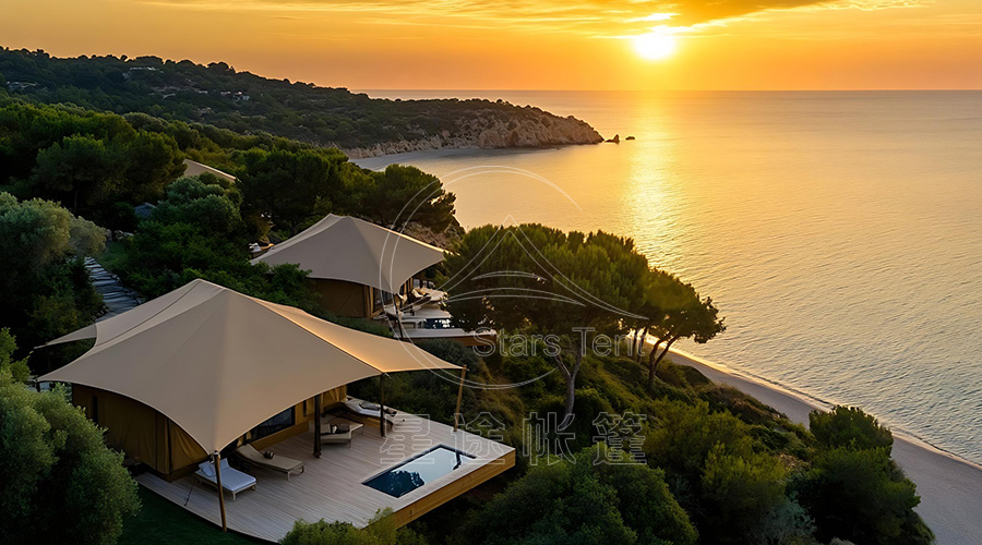 针对高温环境,星途研发出“高效遮阳+智能通风+抗腐蚀”的专用解决方案。中东地区夏季气温常高达50℃,且伴有强风沙,星途为当地度假村定制的野奢帐篷,采用双层遮阳面料,外层面料可阻挡90%以上的阳光直射,内层面料则具备反射热量的功能,有效降低室内温度;同时配备智能通风系统,通过顶部进风口与底部出风口形成强空气对流,将室内热空气快速排出,配合低能耗换气扇辅助通风,即使室外温度达到50℃,室内仍能保持在26℃左右的舒适温度。为应对沙漠地区的强风沙与高盐雾腐蚀,帐篷框架经过特殊防腐处理,面料采用抗风沙耐磨的特种织物,接缝处采用无缝焊接技术,避免风沙渗入室内,确保帐篷在极端环境下的使用寿命。沙特某沙漠度假村项目中,星途帐篷经历了12级沙尘暴的考验,外观与内部设施均完好无损,赢得了海外客户的高度认可。