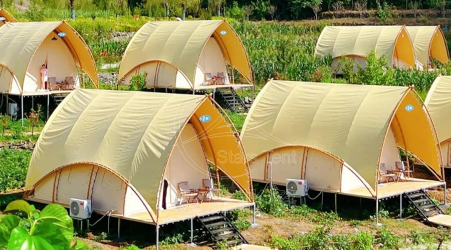 为日本市场打造的轻奢帐篷,紧扣日本“侘寂美学”与环保理念,采用简约大气的设计风格,选用可回收、可降解的环保材质,通过了日本严格的环保认证,帐篷内饰简约雅致,搭配天然竹制家具与有机棉床品,营造出静谧、舒适的住宿氛围,成为当地环保主题营地与高端温泉度假村的核心住宿产品。在加拿大严寒地区,星途升级了帐篷的保温设计,采用三层复合保温面料与密封工艺,搭配高效供暖系统,确保在零下30℃的极端严寒天气下,室内仍能保持温暖舒适,同时优化帐篷的抗雪压结构,可抵御厚重积雪的压迫,保障帐篷的稳定运营。全球化品质的背后,是星途严苛的生产标准与深厚的技术积淀,广州南沙2万平米现代化工厂配备全套自动化生产设备,12道全流程质检体系层层把关,54项国家专利技术加持,让每一顶帐篷都能经受住全球不同环境的考验,符合国际市场的品质标准。
